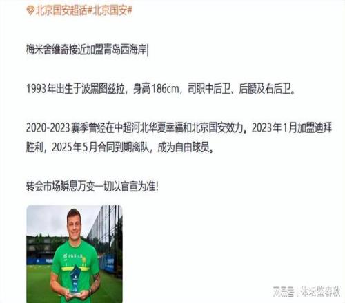 随着中超冬季转会窗的开窗日即将到来,目前国内足球圈的转会消息是越来越多。有些球员的名字出现,肯定会让球迷们感到一愣。近日,据一位北京体育博主透露,前北京国安外援梅米舍维奇将重返中超,接近加盟中超新军青岛西海岸。
