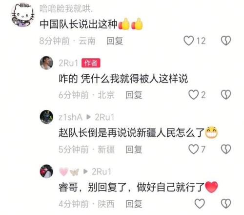 当有球迷质疑“中国队长说出这种话”时,赵睿反驳道:“咋的,凭什么我就得被人这样说。”这种回应方式再次暴露了他处理公众舆论时的情绪控制问题